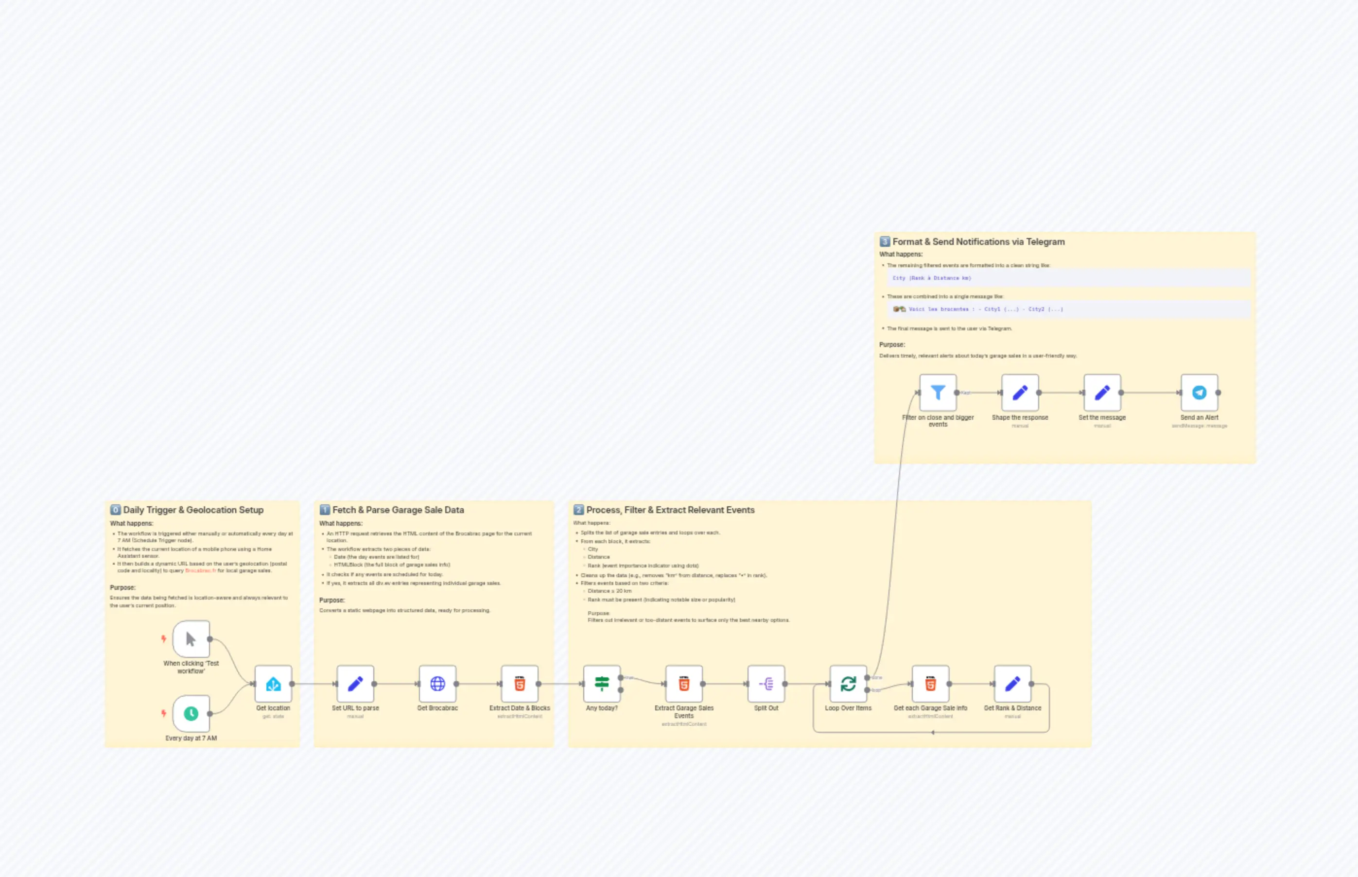 "content": "## 3️⃣ Format & Send Notifications via Telegram\n### What happens:\n- The remaining filtered events are formatted into a clean string like:\n ```\n City (Rank à Distance km)\n ```\n- These are combined into a single message like:\n ```\n 📦🏡 Voici les brocantes : - City1 (...) - City2 (...)\n ```\n- The final message is sent to the user via Telegram.\n\n### Purpose:\nDelivers timely, relevant alerts about today’s garage sales in a user-friendly way."