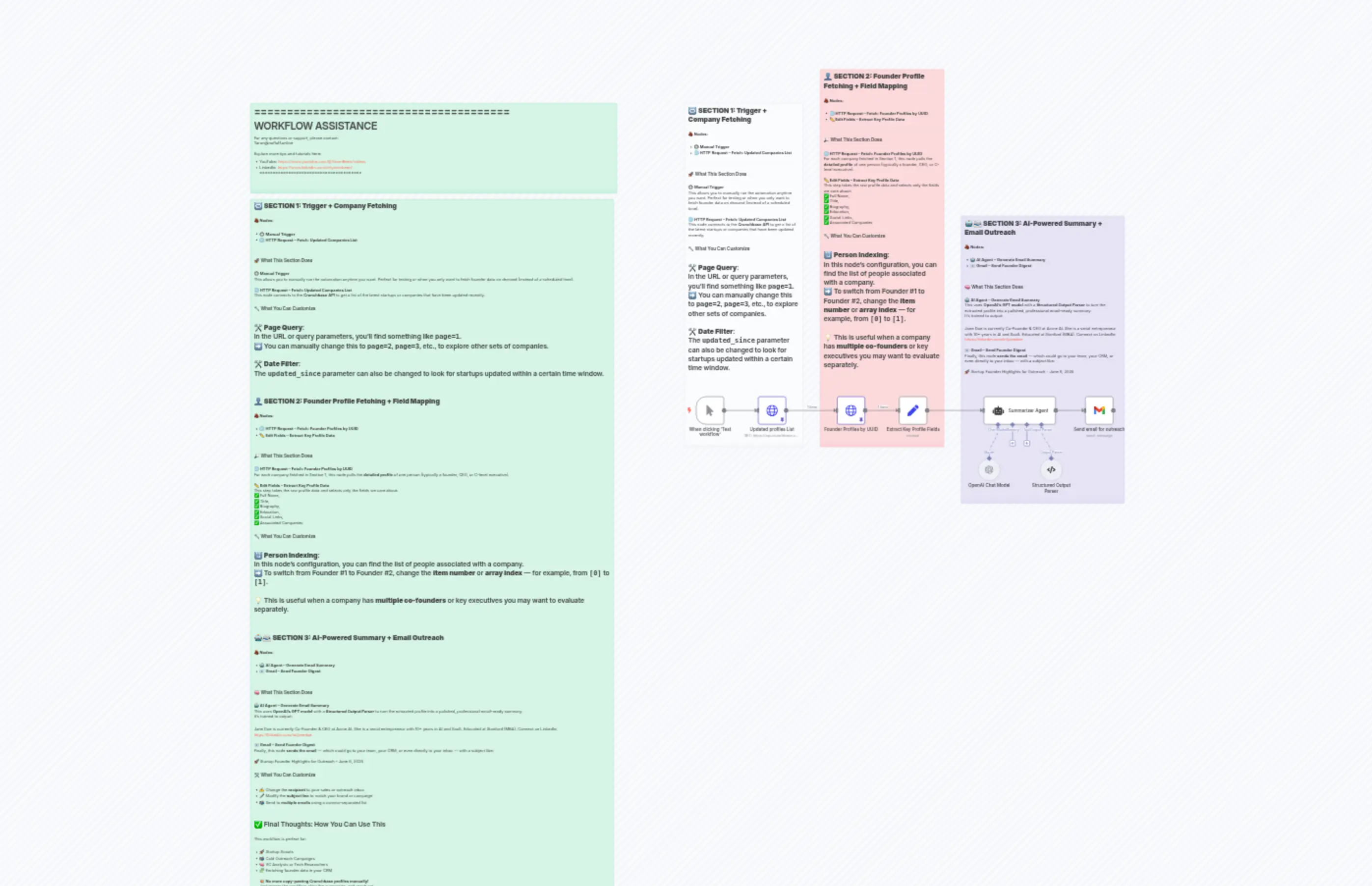 "content": "## 🔁 **SECTION 1: Trigger + Company Fetching**\n\n**🧱 Nodes:**\n\n* 🔘 **Manual Trigger**\n* 🌐 **HTTP Request – Fetch: Updated Companies List**\n\n---\n\n### 🚀 What This Section Does\n\n🔘 **Manual Trigger**\nThis allows you to manually run the automation anytime you want. Perfect for testing or when you only want to fetch founder data on demand (instead of a scheduled time).\n\n🌐 **HTTP Request – Fetch: Updated Companies List**\nThis node connects to the **Crunchbase API** to get a list of the latest startups or companies that have been updated recently.\n\n#### 🔧 What You Can Customize\n\n🛠️ **Page Query**:\nIn the URL or query parameters, you'll find something like `page=1`.\n➡️ You can manually change this to `page=2`, `page=3`, etc., to explore other sets of companies.\n\n🛠️ **Date Filter**:\nThe `updated_since` parameter can also be changed to look for startups updated within a certain time window.\n\n---\n\n## 👤 **SECTION 2: Founder Profile Fetching + Field Mapping**\n\n**🧱 Nodes:**\n\n* 🌐 **HTTP Request – Fetch: Founder Profiles by UUID**\n* ✏️ **Edit Fields – Extract Key Profile Data**\n\n---\n\n### 🔎 What This Section Does\n\n🌐 **HTTP Request – Fetch: Founder Profiles by UUID**\nFor each company fetched in Section 1, this node pulls the **detailed profile** of one person (typically a founder, CEO, or C-level executive).\n\n✏️ **Edit Fields – Extract Key Profile Data**\nThis step takes the raw profile data and selects only the fields we care about:\n✅ Full Name,\n✅ Title,\n✅ Biography,\n✅ Education,\n✅ Social Links,\n✅ Associated Companies\n\n#### 🔧 What You Can Customize\n\n🔢 **Person Indexing**:\nIn this node’s configuration, you can find the list of people associated with a company.\n➡️ To switch from Founder #1 to Founder #2, change the **item number** or **array index** — for example, from `[0]` to `[1]`.\n\n💡 This is useful when a company has **multiple co-founders** or key executives you may want to evaluate separately.\n\n---\n\n## 🤖📨 **SECTION 3: AI-Powered Summary + Email Outreach**\n\n**🧱 Nodes:**\n\n* 🤖 **AI Agent – Generate Email Summary**\n* 📧 **Gmail – Send Founder Digest**\n\n---\n\n### 🧠 What This Section Does\n\n🤖 **AI Agent – Generate Email Summary**\nThis uses **OpenAI’s GPT model** with a **Structured Output Parser** to turn the extracted profile into a polished, professional email-ready summary.\nIt's trained to output:\n\n> Jane Doe is currently Co-Founder & CEO at Acme AI. She is a serial entrepreneur with 10+ years in AI and SaaS. Educated at Stanford (MBA). Connect on LinkedIn: [https://linkedin.com/in/janedoe](https://linkedin.com/in/janedoe)\n\n📧 **Gmail – Send Founder Digest**\nFinally, this node **sends the email** — which could go to your team, your CRM, or even directly to your inbox — with a subject like:\n\n> 🚀 Startup Founder Highlights for Outreach - June 6, 2025\n\n#### 🛠️ What You Can Customize\n\n* ✍️ Change the **recipient** to your sales or outreach inbox\n* 🖋️ Modify the **subject line** to match your brand or campaign\n* 📬 Send to **multiple emails** using a comma-separated list\n\n---\n\n## ✅ Final Thoughts: How You Can Use This\n\nThis workflow is perfect for:\n\n* 🚀 Startup Scouts\n* 📬 Cold Outreach Campaigns\n* 🧠 VC Analysts or Tech Researchers\n* 🧩 Enriching founder data in your CRM\n\n💥 **No more copy-pasting Crunchbase profiles manually!**\nJust trigger the workflow, skim the summaries, and reach out.\n\n---\n\n"