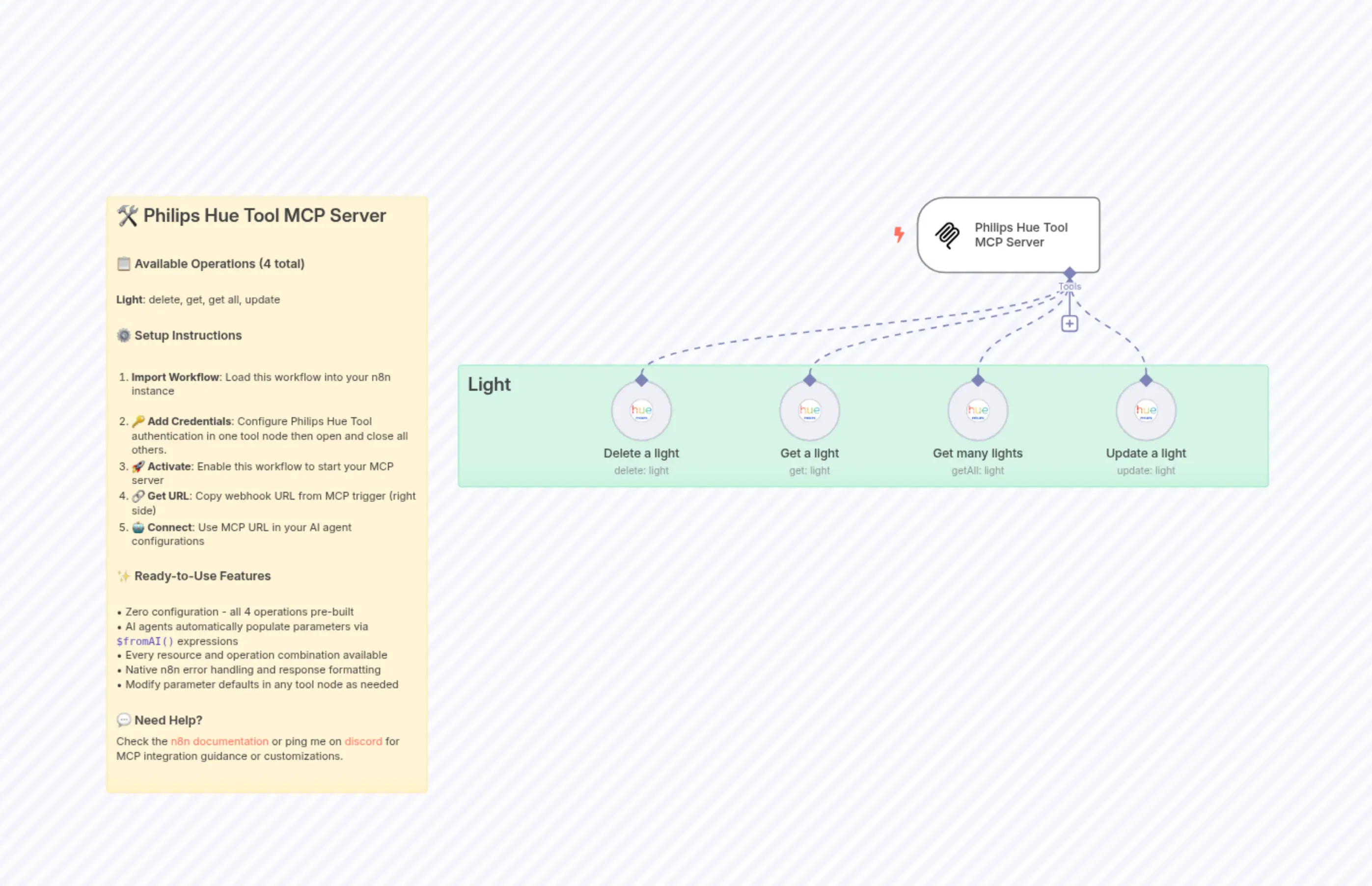 "content": "## 🛠️ Philips Hue Tool MCP Server\n\n### 📋 Available Operations (4 total)\n\n**Light**: delete, get, get all, update\n\n### ⚙️ Setup Instructions\n\n1. **Import Workflow**: Load this workflow into your n8n instance\n\n1. **🔑 Add Credentials**: Configure Philips Hue Tool authentication in one tool node then open and close all others.\n2. **🚀 Activate**: Enable this workflow to start your MCP server\n3. **🔗 Get URL**: Copy webhook URL from MCP trigger (right side)\n4. **🤖 Connect**: Use MCP URL in your AI agent configurations\n\n### ✨ Ready-to-Use Features\n\n• Zero configuration - all 4 operations pre-built\n• AI agents automatically populate parameters via `$fromAI()` expressions\n• Every resource and operation combination available\n• Native n8n error handling and response formatting\n• Modify parameter defaults in any tool node as needed\n\n### 💬 Need Help?\nCheck the [n8n documentation](https://docs.n8n.io/integrations/builtin/cluster-nodes/sub-nodes/n8n-nodes-langchain.toolmcp/) or ping me on [discord](https://discord.me/cfomodz) for MCP integration guidance or customizations."