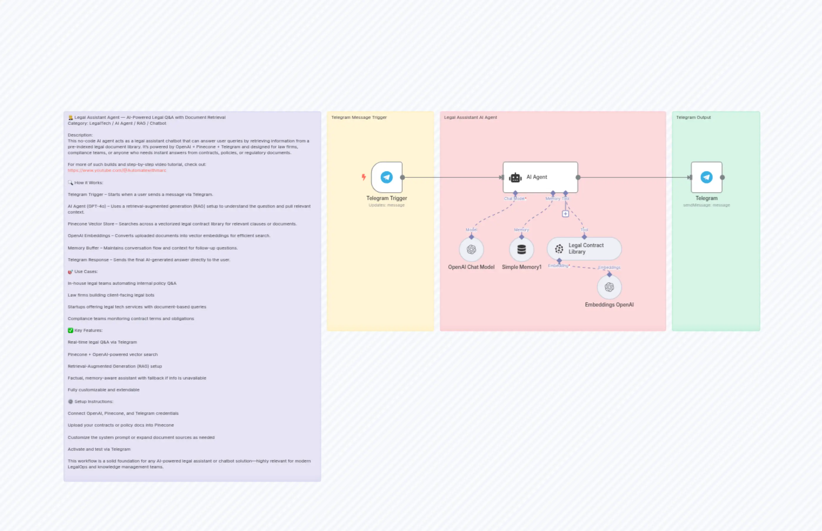 "content": "🧑⚖️ Legal Assistant Agent — AI-Powered Legal Q&A with Document Retrieval\nCategory: LegalTech / AI Agent / RAG / Chatbot\n\nDescription:\nThis no-code AI agent acts as a legal assistant chatbot that can answer user queries by retrieving information from a pre-indexed legal document library. It’s powered by OpenAI + Pinecone + Telegram and designed for law firms, compliance teams, or anyone who needs instant answers from contracts, policies, or regulatory documents.\n\nFor more of such builds and step-by-step video tutorial, check out:\nhttps://www.youtube.com/@Automatewithmarc\n\n🔍 How it Works:\n\nTelegram Trigger – Starts when a user sends a message via Telegram.\n\nAI Agent (GPT-4o) – Uses a retrieval-augmented generation (RAG) setup to understand the question and pull relevant context.\n\nPinecone Vector Store – Searches across a vectorized legal contract library for relevant clauses or documents.\n\nOpenAI Embeddings – Converts uploaded documents into vector embeddings for efficient search.\n\nMemory Buffer – Maintains conversation flow and context for follow-up questions.\n\nTelegram Response – Sends the final AI-generated answer directly to the user.\n\n🎯 Use Cases:\n\nIn-house legal teams automating internal policy Q&A\n\nLaw firms building client-facing legal bots\n\nStartups offering legal tech services with document-based queries\n\nCompliance teams monitoring contract terms and obligations\n\n✅ Key Features:\n\nReal-time legal Q&A via Telegram\n\nPinecone + OpenAI-powered vector search\n\nRetrieval-Augmented Generation (RAG) setup\n\nFactual, memory-aware assistant with fallback if info is unavailable\n\nFully customizable and extendable\n\n⚙️ Setup Instructions:\n\nConnect OpenAI, Pinecone, and Telegram credentials\n\nUpload your contracts or policy docs into Pinecone\n\nCustomize the system prompt or expand document sources as needed\n\nActivate and test via Telegram\n\nThis workflow is a solid foundation for any AI-powered legal assistant or chatbot solution—highly relevant for modern LegalOps and knowledge management teams."