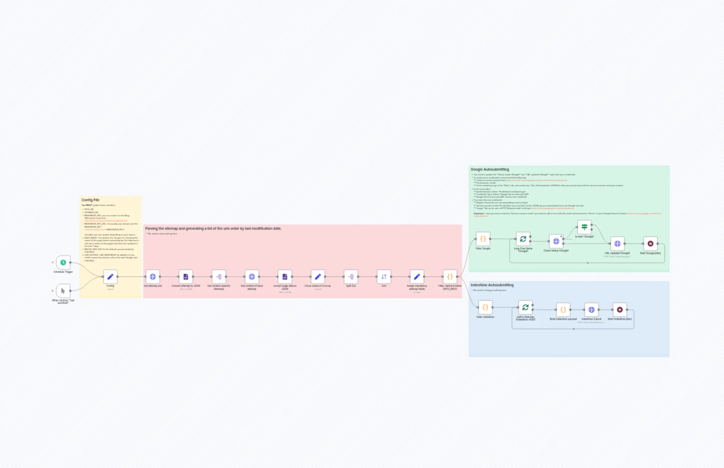 "content": "## Google Autosubmitting\n* You need to update the \"Check status (Google)\" and \"URL updated (Google)\" node with your credentials\n* To create your credentials I recommend the following:\n** Create a service account here https://console.cloud.google.com/iam-admin/serviceaccounts\n** Permissions: Owner\n** Once created you go in the \"Keys\" tab, and create key. That will download a JSON file with your private key and the service account email you created\n* In the two nodes:\n** Authentication: Select \"Predefined credential type\"\n** Credential Type: Select \"Google Service Account API\"\n** Google Service Account API: Create new credential\n* To create the new credential:\n** Region: chose the one corresponding to your project\n** Service account email / Private Key: you can find it in the JSON key you downloaded from the Google Console\n** Toogle \"Set up for use in HTTP Request node\" and input https://www.googleapis.com/auth/indexing\n\n**Important** - once you have created a \"Service account email\" you need to add a user with this email and permission \"Owner\" in your Google Search Console: https://search.google.com/search-console/users"