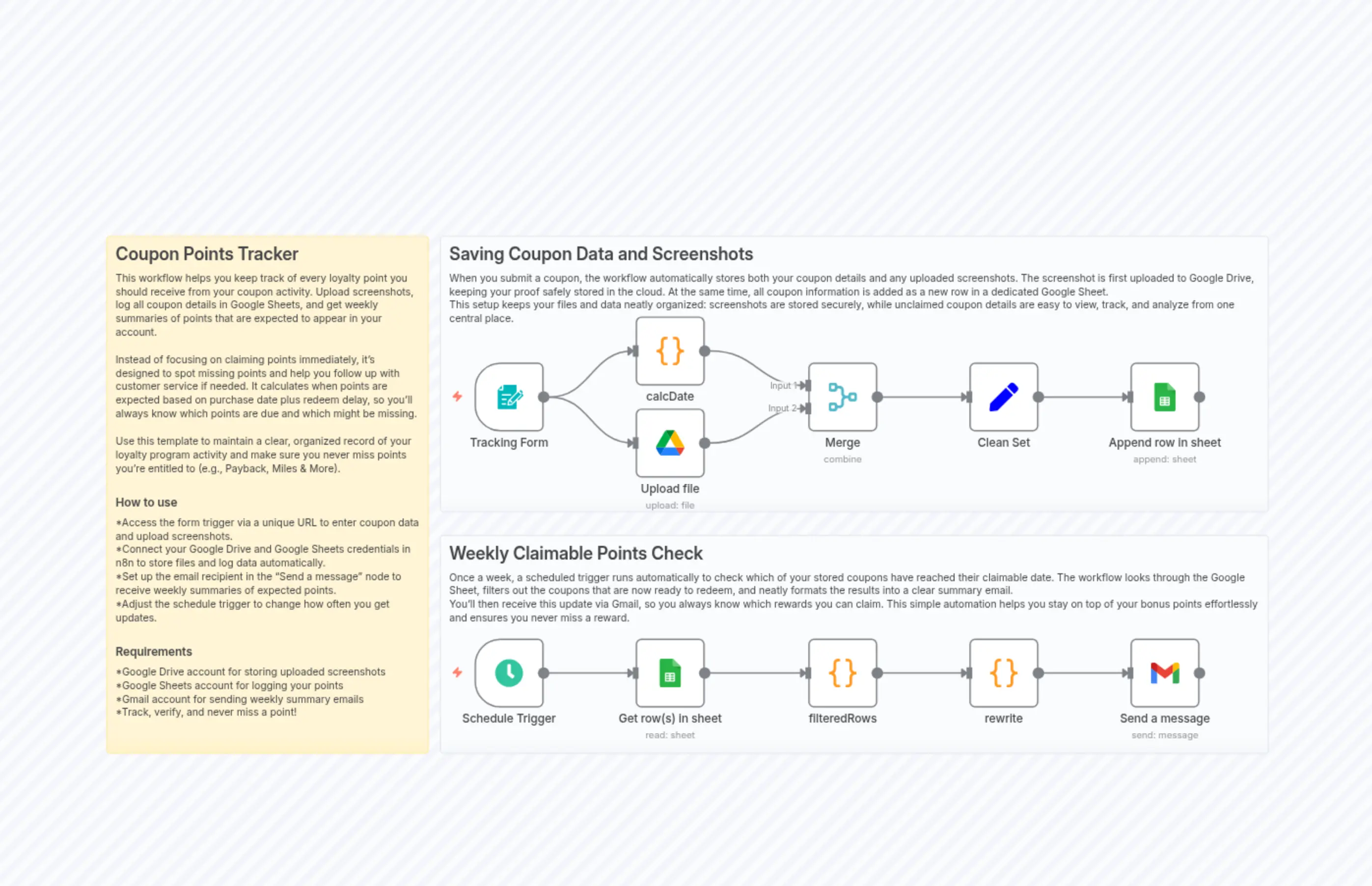 "content": "## Coupon Points Tracker\nThis workflow helps you keep track of every loyalty point you should receive from your coupon activity. Upload screenshots, log all coupon details in Google Sheets, and get weekly summaries of points that are expected to appear in your account.\n\nInstead of focusing on claiming points immediately, it’s designed to spot missing points and help you follow up with customer service if needed. It calculates when points are expected based on purchase date plus redeem delay, so you’ll always know which points are due and which might be missing.\n\nUse this template to maintain a clear, organized record of your loyalty program activity and make sure you never miss points you’re entitled to (e.g., Payback, Miles & More).\n\n### How to use\n*Access the form trigger via a unique URL to enter coupon data and upload screenshots.\n*Connect your Google Drive and Google Sheets credentials in n8n to store files and log data automatically.\n*Set up the email recipient in the “Send a message” node to receive weekly summaries of expected points.\n*Adjust the schedule trigger to change how often you get updates.\n\n### Requirements\n*Google Drive account for storing uploaded screenshots\n*Google Sheets account for logging your points\n*Gmail account for sending weekly summary emails\n*Track, verify, and never miss a point!"