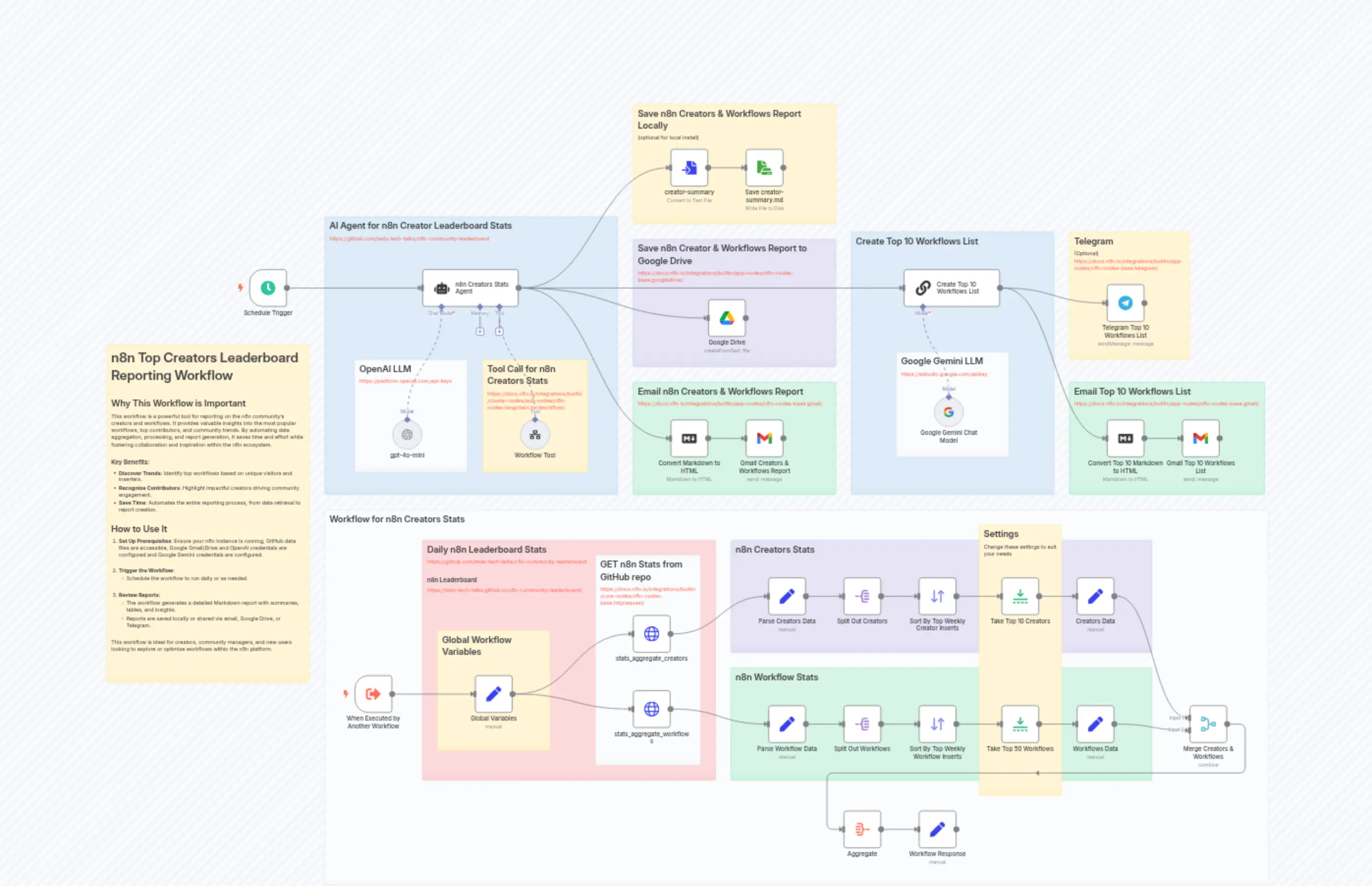 "content": "# n8n Top Creators Leaderboard Reporting Workflow\n\n## Why This Workflow is Important\nThis workflow is a powerful tool for reporting on the n8n community's creators and workflows. It provides valuable insights into the most popular workflows, top contributors, and community trends. By automating data aggregation, processing, and report generation, it saves time and effort while fostering collaboration and inspiration within the n8n ecosystem.\n\n### Key Benefits:\n- **Discover Trends**: Identify top workflows based on unique visitors and inserters.\n- **Recognize Contributors**: Highlight impactful creators driving community engagement.\n- **Save Time**: Automates the entire reporting process, from data retrieval to report creation.\n\n## How to Use It\n1. **Set Up Prerequisites**: Ensure your n8n instance is running, GitHub data files are accessible, Google Gmail/Drive and OpenAI credentials are configured and Google Gemini credentials are configured.\n\n2. **Trigger the Workflow**:\n - Schedule the workflow to run daily or as needed.\n\n3. **Review Reports**:\n - The workflow generates a detailed Markdown report with summaries, tables, and insights.\n - Reports are saved locally or shared via email, Google Drive, or Telegram.\n\n\nThis workflow is ideal for creators, community managers, and new users looking to explore or optimize workflows within the n8n platform.\n"